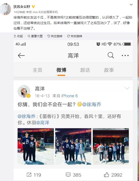 当然了,也有机智细心的网友爆料,说其实徐海乔难免和高洋有点绯闻恋情。