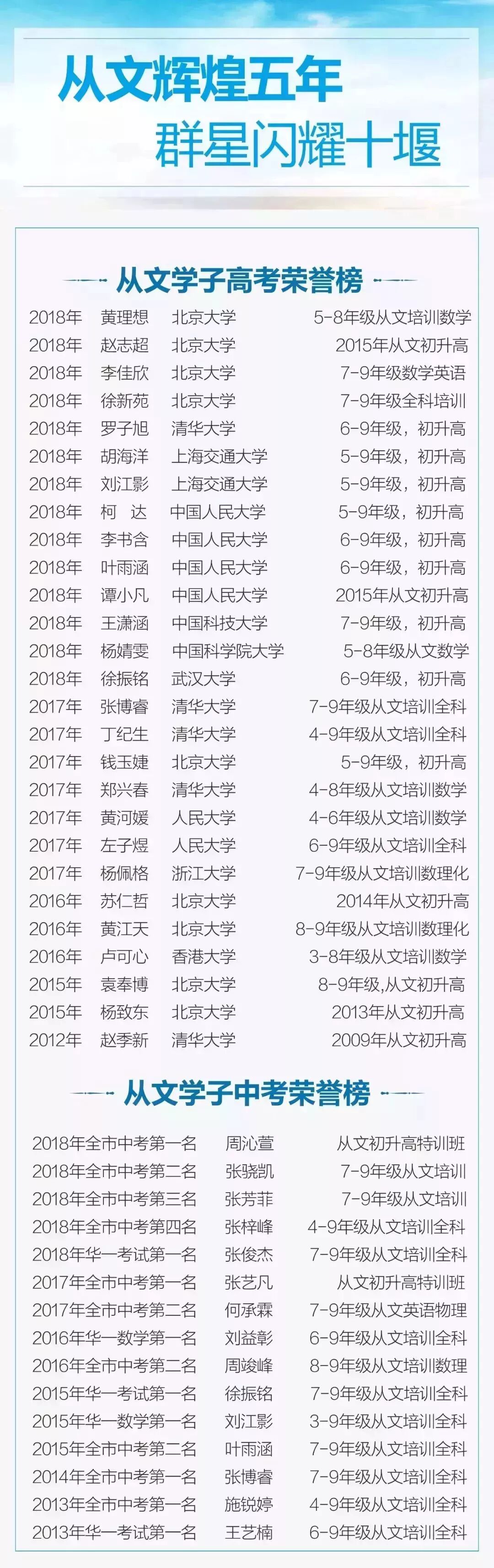 今天给大家介绍的几十名优秀学生,很小就重视语数外三科的学习,有的小学一二年级,有的小学四五年级就来到从文培训,从文规范正向的教育让他们打下很好的基础,一路走来,成绩都是出类拔萃,他们了解从文,坚定地相信从文,如今成为家长的骄傲,从文的骄傲!