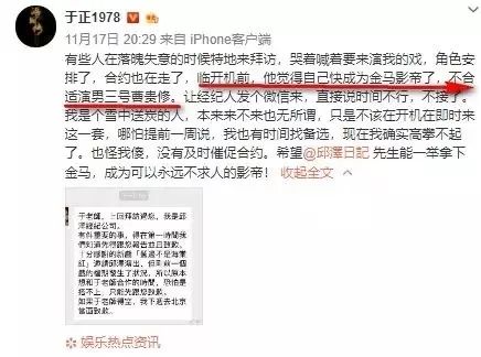 首先声明,于正这部戏是明年2月份开拍,和邱泽的档期有冲突,自己现在通知应该是来得及的,没想到于正居然这么生气。