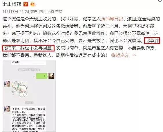 面对粉丝的质疑,于正发出了第二条微博表示不是自己挑事蹭热度,是邱泽临时变卦,“微信是今晚才收到,我也很纳闷儿,早不发晚不发偏偏是这个时候”。