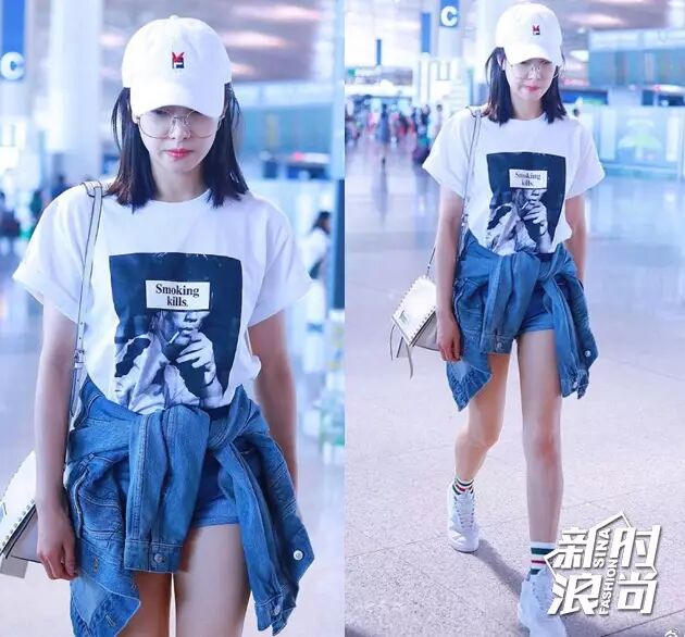 7月9日宋茜一身潮装现身机场,她身穿日本潮牌FR2 “Smoking Kills” T恤搭配Prada Etiquette包,大框金丝眼镜与特别提高的短袜为整身搭配增加复古味道,短裤下装清凉同时又秀出长腿,这身街头感潮装令其活力十足。