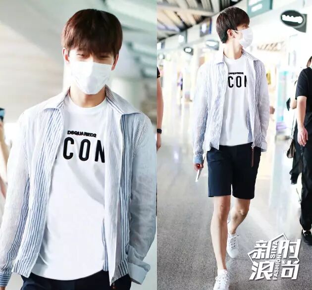 DSQUARED2 2017早秋系列ICON T恤,外搭LOEWE条纹夹克,下穿清凉短裤及小白鞋现身机场。另外一身Givenchy红色T恤搭配破洞裤,阳光型男的气场爆棚,引得粉丝们一众围观,来自FENDI的双肩包也是活力十足,跟此套搭配完美契合。