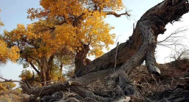 人们夸赞胡杨巨大的生命力是“三个一千年”,即活着一千年不死,死后一千年不倒,倒后一千年不朽。