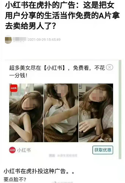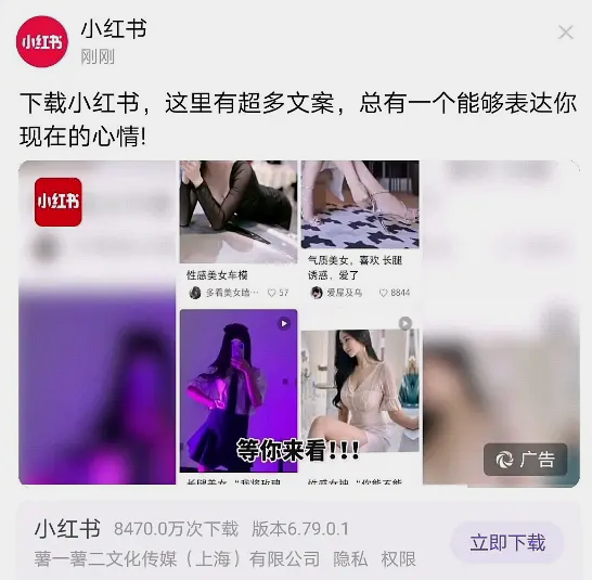 例如今年,小红书在百度贴吧投放广告时,就在众多“气质美女”“性感美女”的照片上,打上了四个大字和三个感叹号——