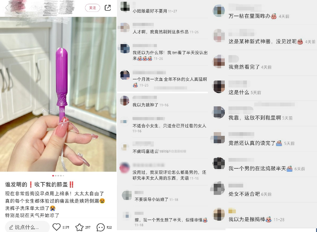 在一则笔记里,有人感叹了卫生棉条的使用体验,没想到引来了一批阴阳怪气的男性评论。