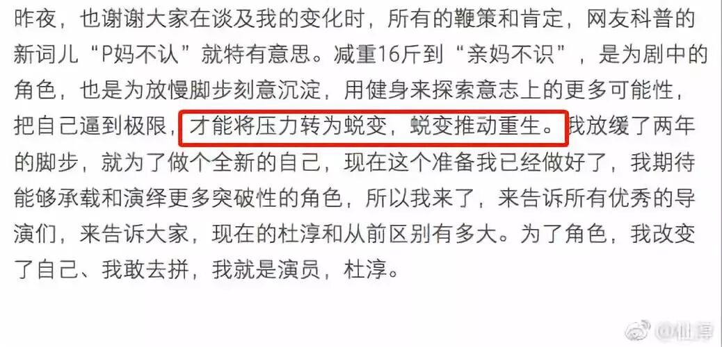 在微博上,杜淳还喊话要演更多突破性的角色,用蜕变推动重生。