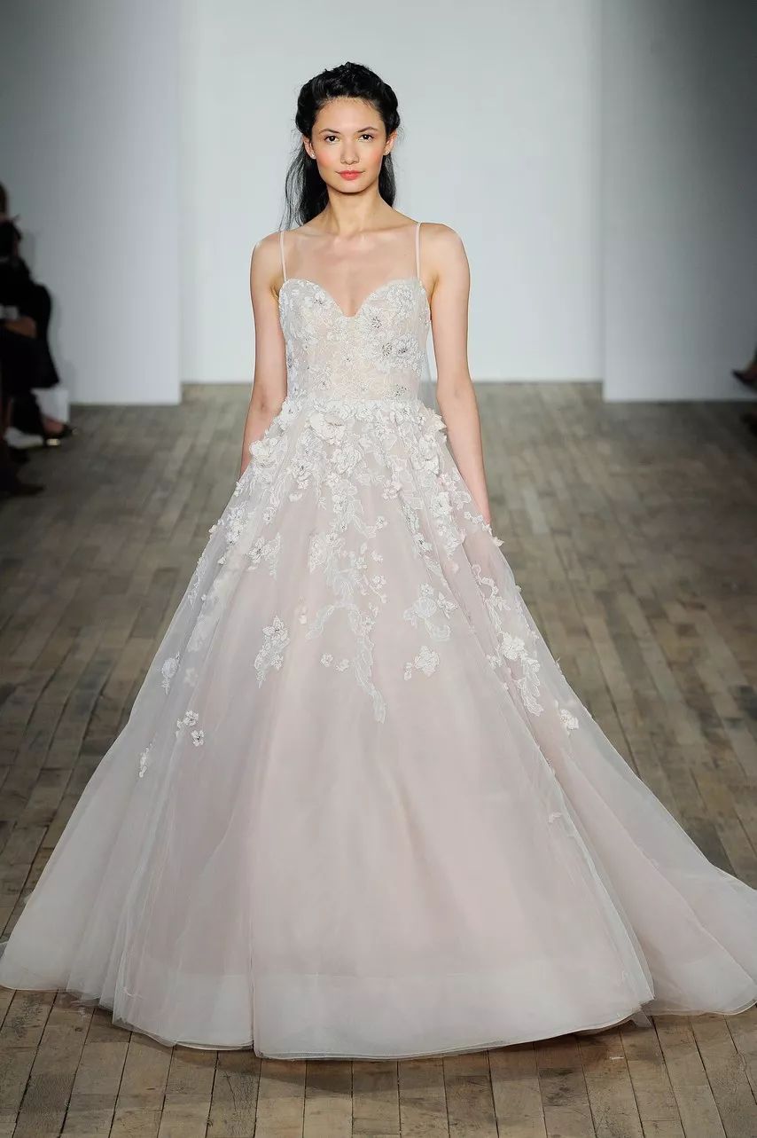 落肩婚纱一直都是新娘子们热衷的款式,它能恰到好处地露出优美的锁骨和肩部线条,性感却不媚俗。但这种款式很考验自身体态,像是溜肩穿起来无疑是一场灾难。穿着时也要注意挺胸不要驼背,否则气质大打折扣。