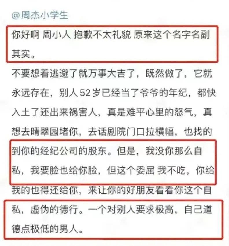 “周杰,你都52岁了,还出来祸害人。” “不要找我们这样的好人,你玩到病入土都没人管你。”
