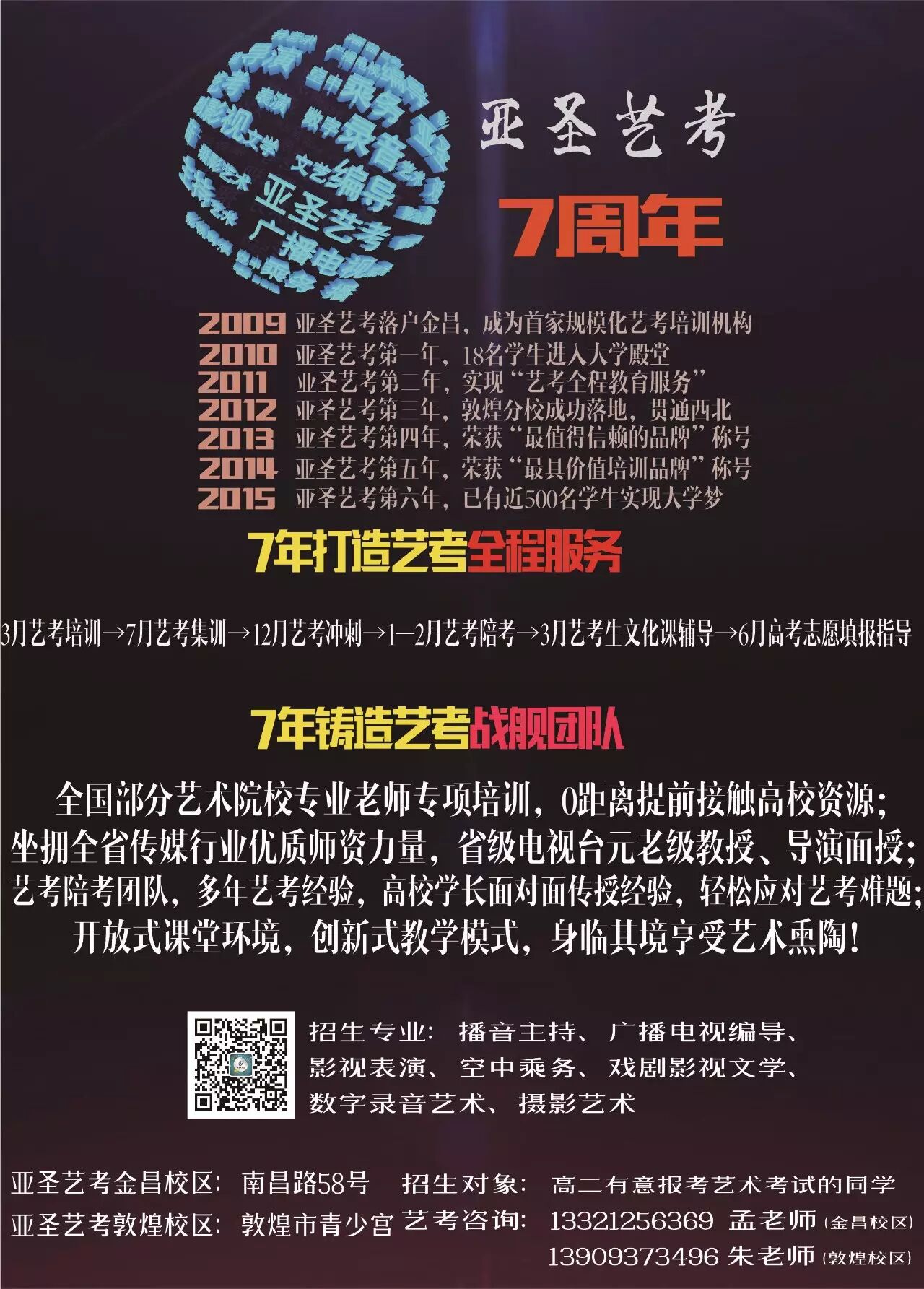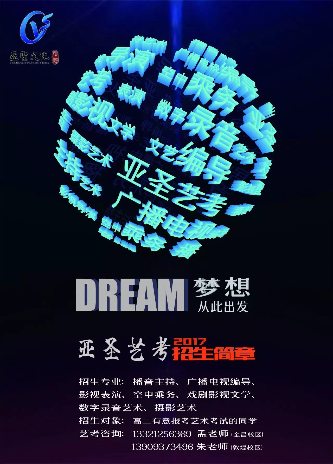 2017年艺考招生大幕现已拉起,播音主持、广播电视编导、表演、导演、空中乘务等专业面向全省高二学生招生,如果你想实现自己的传媒梦,主播梦、导演梦、明星梦,就来甘肃亚圣影视传媒学校!
