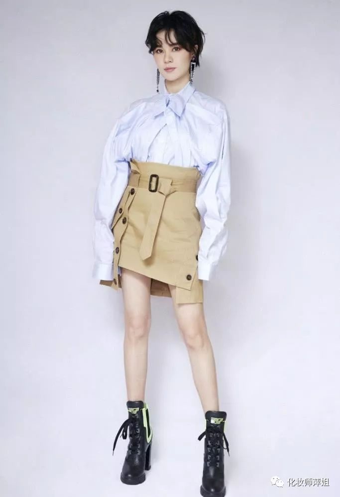 那么,郁可唯的其他穿搭是怎么样的呢?我们可以一起来看看。她这次耳戴一对银色耳环,大型的款式,可以显得脸小。穿了一件蓝色衬衫,在领口绑了一个蝴蝶结,尽显青春时尚。而下半身穿了一条米黄色的半身裙+黑色高跟靴,裙子是高腰的款式,很好地提升了腰线,展现出一双迷人的大长腿。大家喜不喜欢郁可唯的穿搭呢?