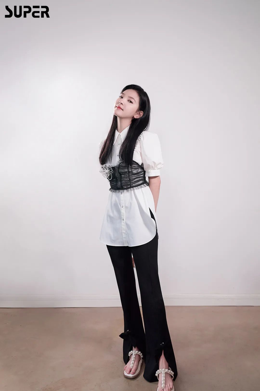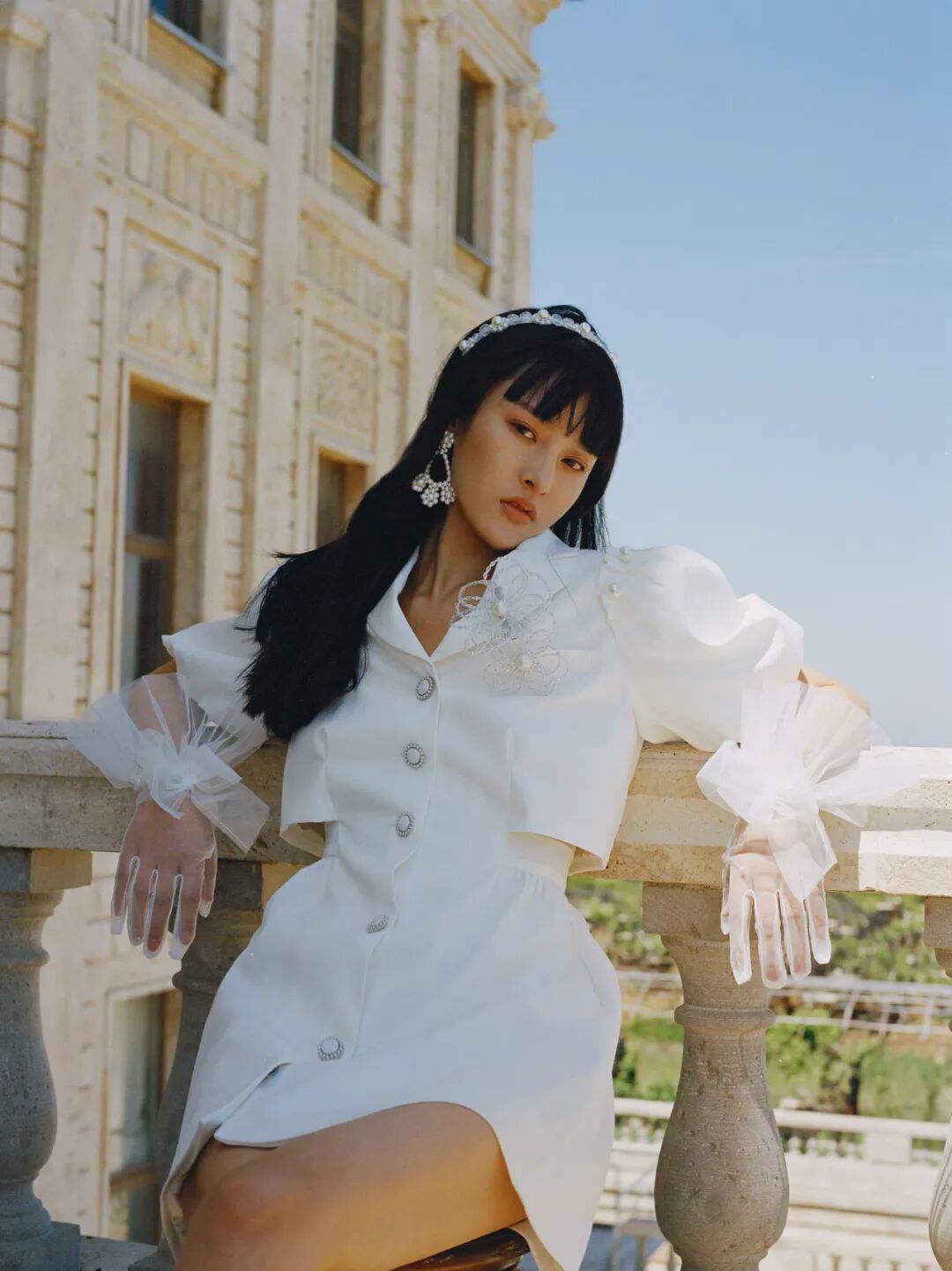 穿上白色西装连衣裙,再搭配珍珠和公主花做装饰,完全是个甜酷girl~