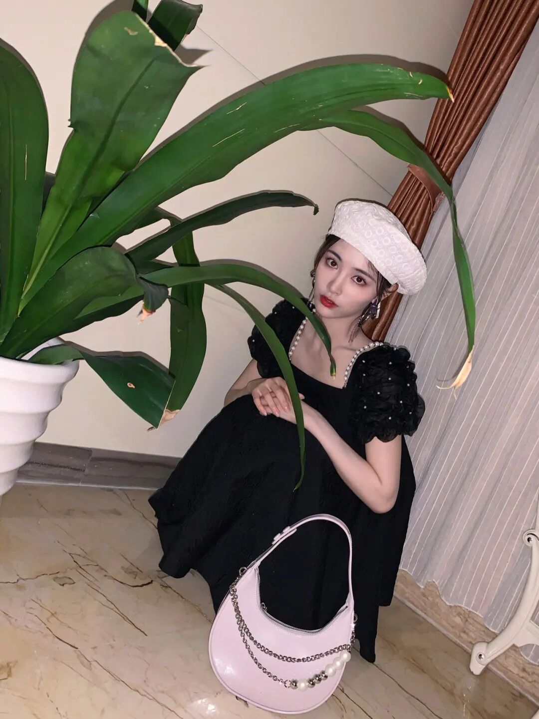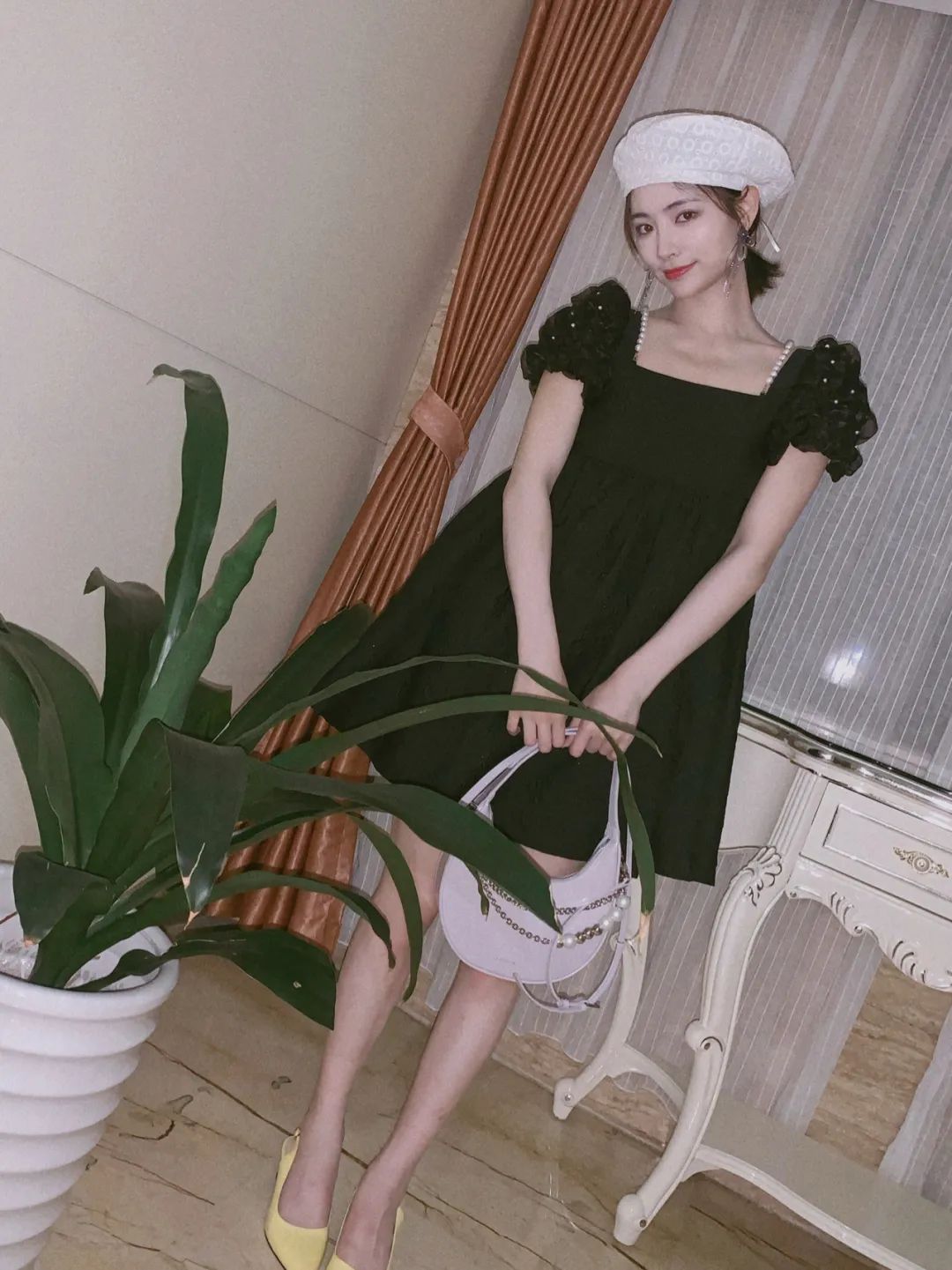 这条小黑裙许佳琪也穿过,搭配了白色帽子和包包,看起来更有甜美气息。