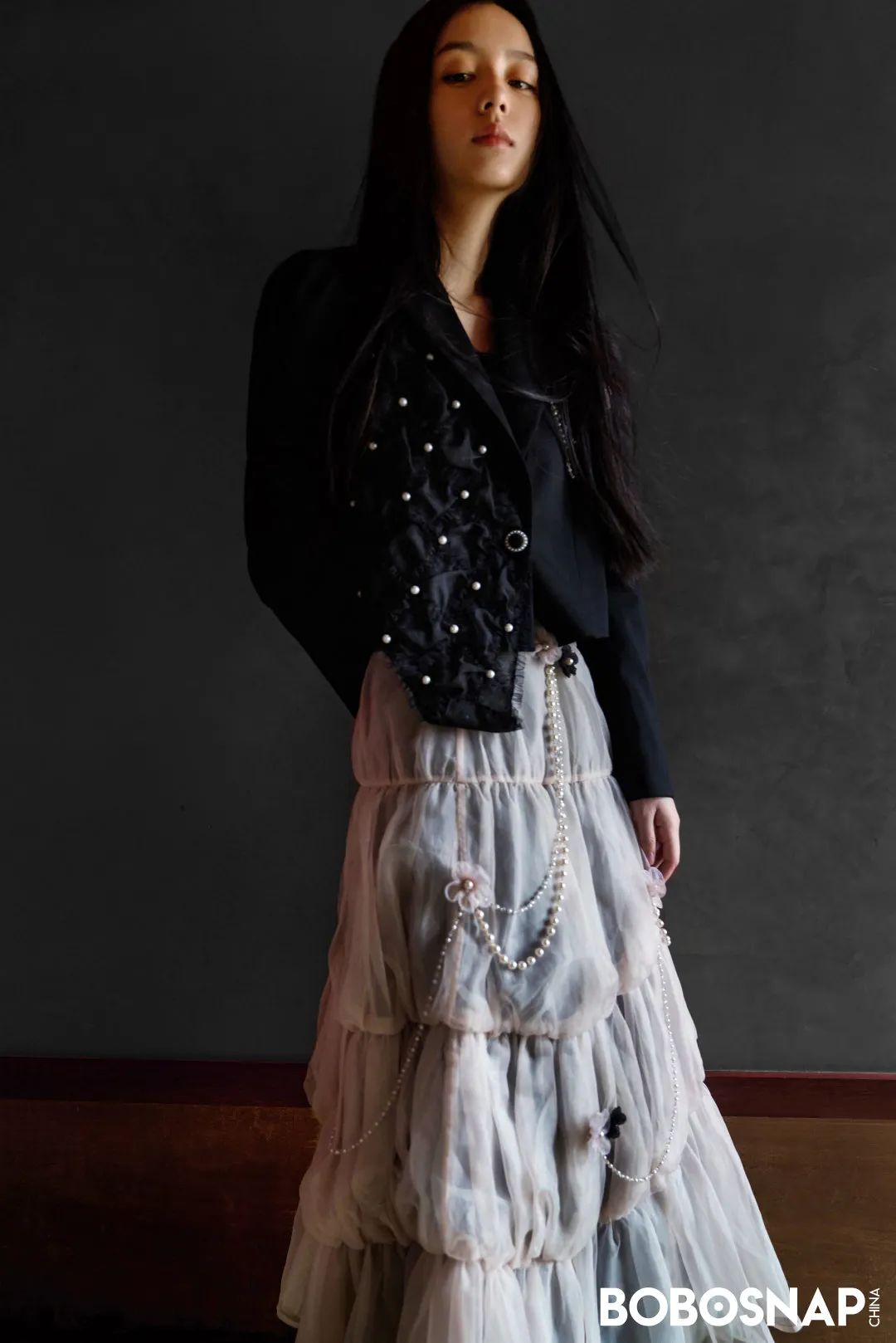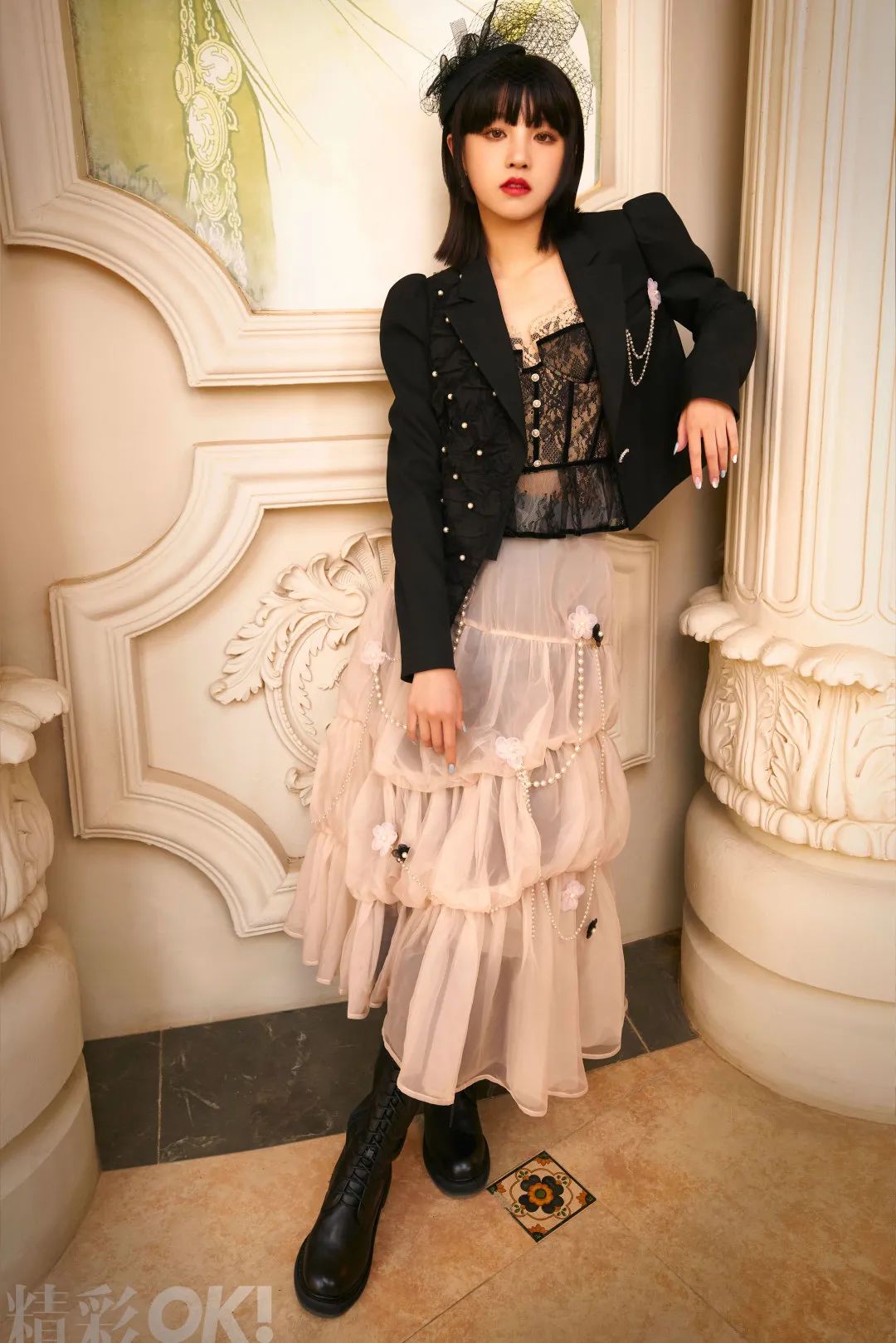 有点酷的短款西装被公主花网纱簇拥,亦刚亦柔,感觉个性十足。