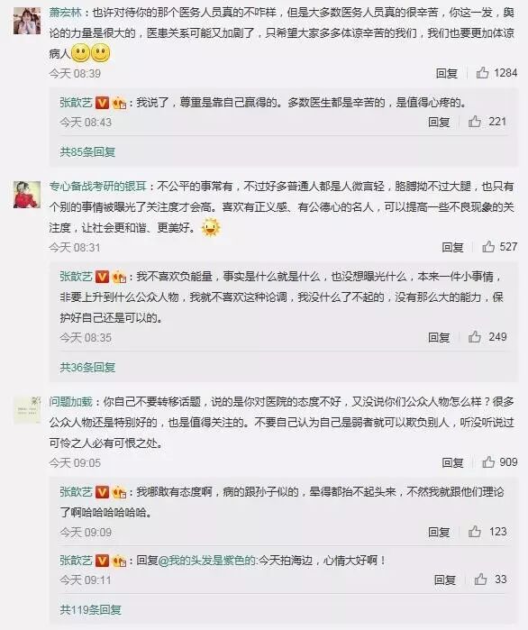其实张歆艺在微博的评论中也特别提到,她不想公布医院的名称和医生的名字,就是不想让人觉得她在滥用明星的影响力↓