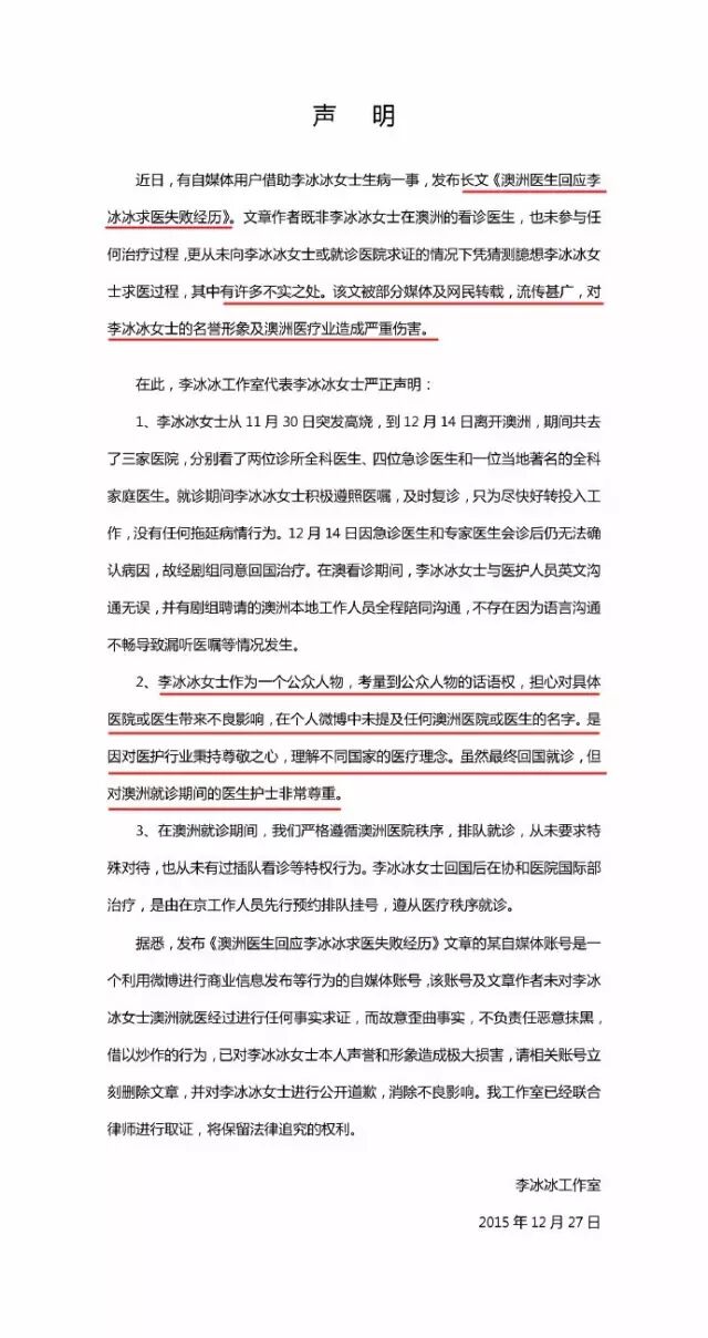 之后,有自媒体发文臆测了李冰冰在澳洲的求医过程,李冰冰工作室还发表了声明,“对李冰冰的名誉形象及澳洲医疗事业造成严重伤害”↓