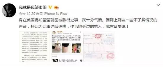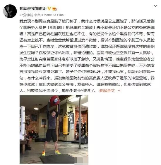 这条微博却招来很多网友类似“公众人物不该公开指责医生”的骂声。于是“护妻狂魔”邹市明在微博晒出收据,怒斥医院在没有开药和打针的情况下收取高达1845元的医药费。