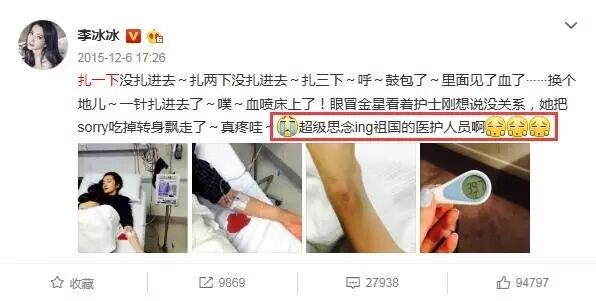 当当当当!这里小懂就不得不提一下李冰冰啦,正所谓公关团队选得好,发布微博没烦恼!去年李冰冰也曾在微博吐槽护士扎针不够专业。