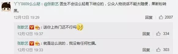 比如有网友艾特张歆艺说“医生不会这么轻易下结论的,公众人物说话不能太随便”,立刻得到张歆艺的回复:“就是这么说的,我没有任何杜撰,送你上热门还不行吗?”