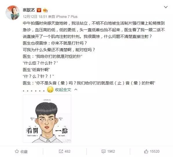 原来是张歆艺发微博抱怨自己因头晕无法站立而挂急诊时,医生二话不说直接开了“纸音针(止晕针)”,让她怀疑是否能够对症下药,怎么看都有点指责医生不专业的意味在里面。