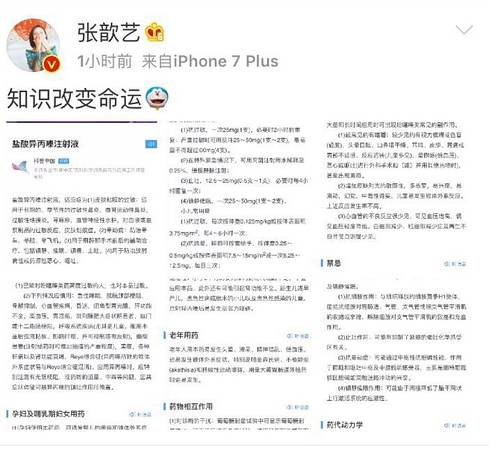 于是张歆艺又发了一条微博说“知识改变命运”,配图全都是关于那剂“止晕针”的百度百科。