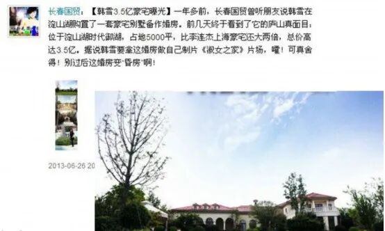 当年知名博主“长春国贸”曝光了韩雪价值3亿的豪宅。这座豪宅位于淀山湖时代御湖,占地5000平。