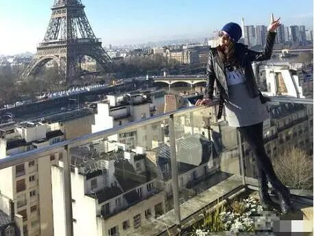 照片中,陈乔恩站在高楼顶层,背景就是埃菲尔铁塔,她摆出不同的造型,长腿逆天。