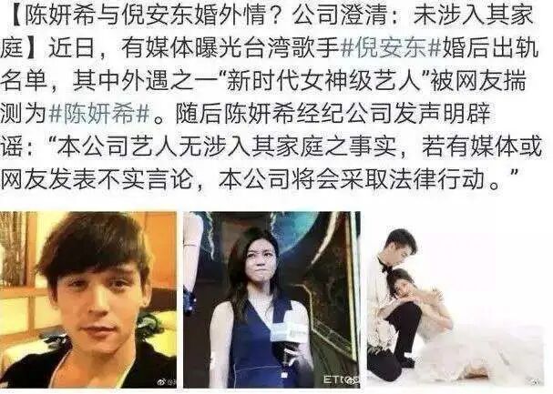 这才过去没多久,陈妍希就被传与倪安东有婚外情。有网友称台湾歌手倪安东被曝的出轨名单中有“新时代的女神级艺人”,不少网友都猜测为陈妍希。