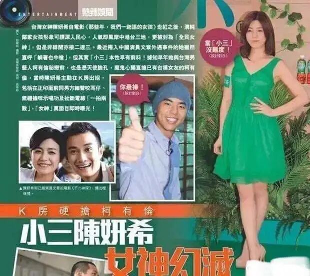 不过柯有纶前女友的朋友却对媒体爆料,称陈妍希和柯有纶在一起的时候,是小三插足,当时的柯有纶是有女朋友的,但是在某次唱KTV的时候,陈妍希直接无视柯有纶的正牌女友,对柯有纶频繁放电。