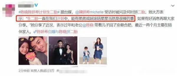 其实在3月7号的时候,有记者就曾问到陈妍希什么时候会要二胎,陈妍希就称,她和陈晓都一直在计划当中,有好消息的话肯定会和大家分享,并称自己也在积极备孕。