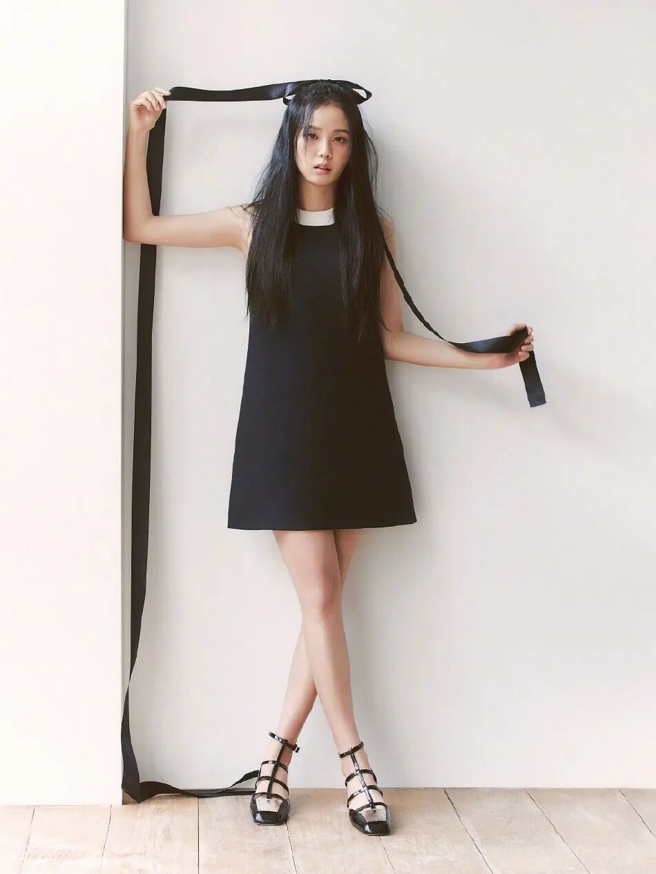 金智秀身穿黑色发带衣裙,她俏脸清丽,秀眸明亮,乌黑的秀发飘逸如瀑布,单手撩着黑色长发带,露出白皙的大美腿,绝对性感撩人。