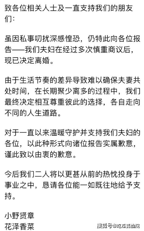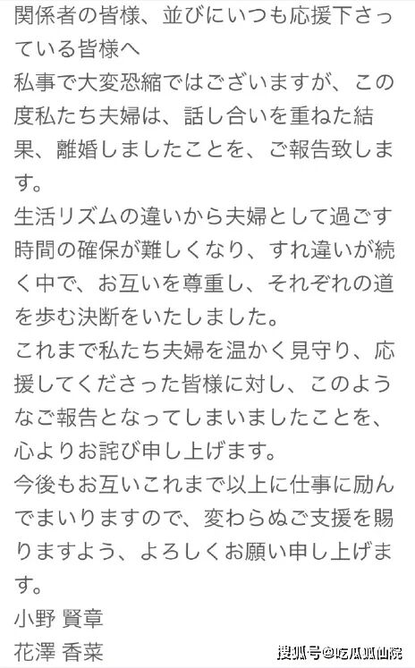 9月14日当天,花泽香菜在自己的Instagram账号上发布了手写风格的声明,字里行间透着平静与郑重;而小野贤章则通过个人X账号(原推特)同步了相同核心内容的消息,确保粉丝与关注者能第一时间知晓真相。