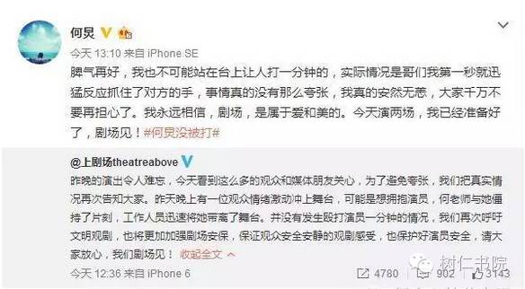 随着事态的发酵,何炅以免事实被夸大,也害怕粉丝担心,又一次发文否认自己被打,称“脾气再好,我也不可能站在台上让人打一分钟的,实际情况是哥们我第一秒就迅猛反应抓住了对方的手,事情真的没有那么夸张,我真的安然无恙,大家千万不要再担心了。我永远相信,剧场,是属于爱和美的。今天演两场,我已经准备好了,剧场见!”
