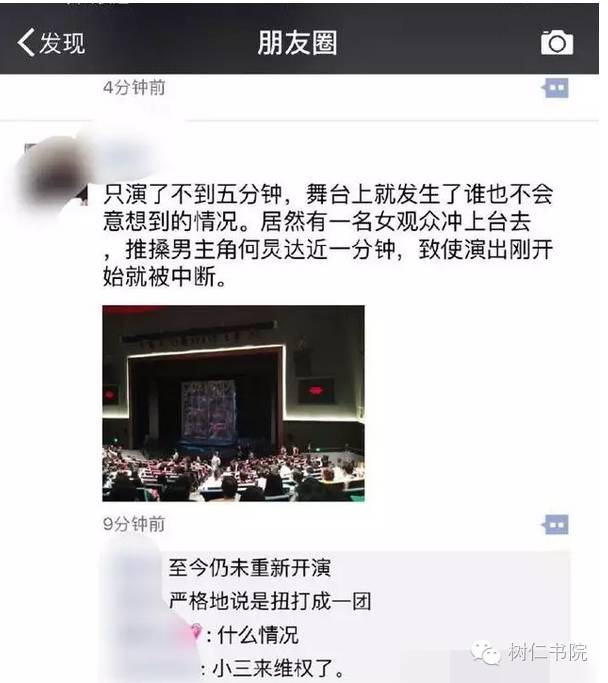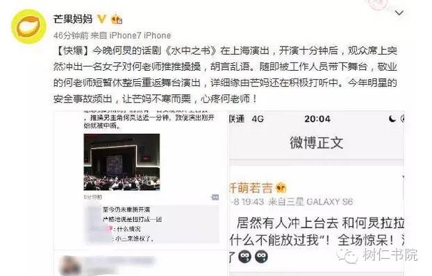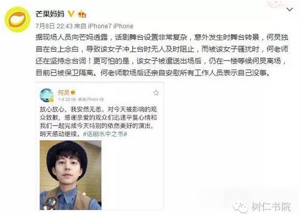 7月8日,何炅在上海演出话剧大师赖声川导演的作品《水中之书》,节目刚开始一位女子冲上舞台。据现场的观众描述,话剧刚开始,一位女子冲上舞台推搡,厮打何炅,一边用拳头捶何炅一边大喊:你为什么不放过我。之后被工作人员带下舞台,演出也暂停。
