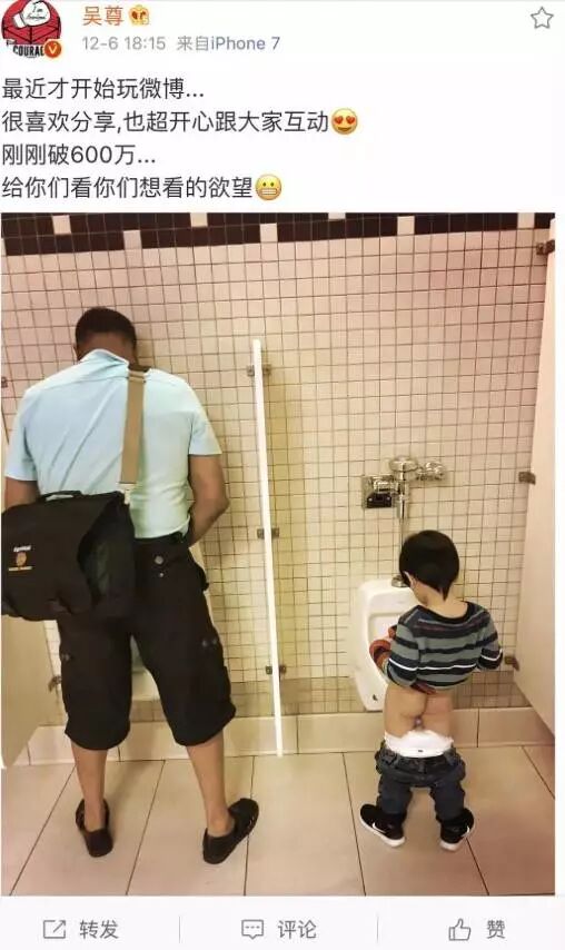 方媛或许是无心之失,那吴尊就算是心大了。昨天他为了庆祝自己微博粉丝突破600万,晒了一张儿子max在公厕小便的照片,图片中儿子光着屁股,旁边还有一位不知名的成年男子,站在尿兜前小便……