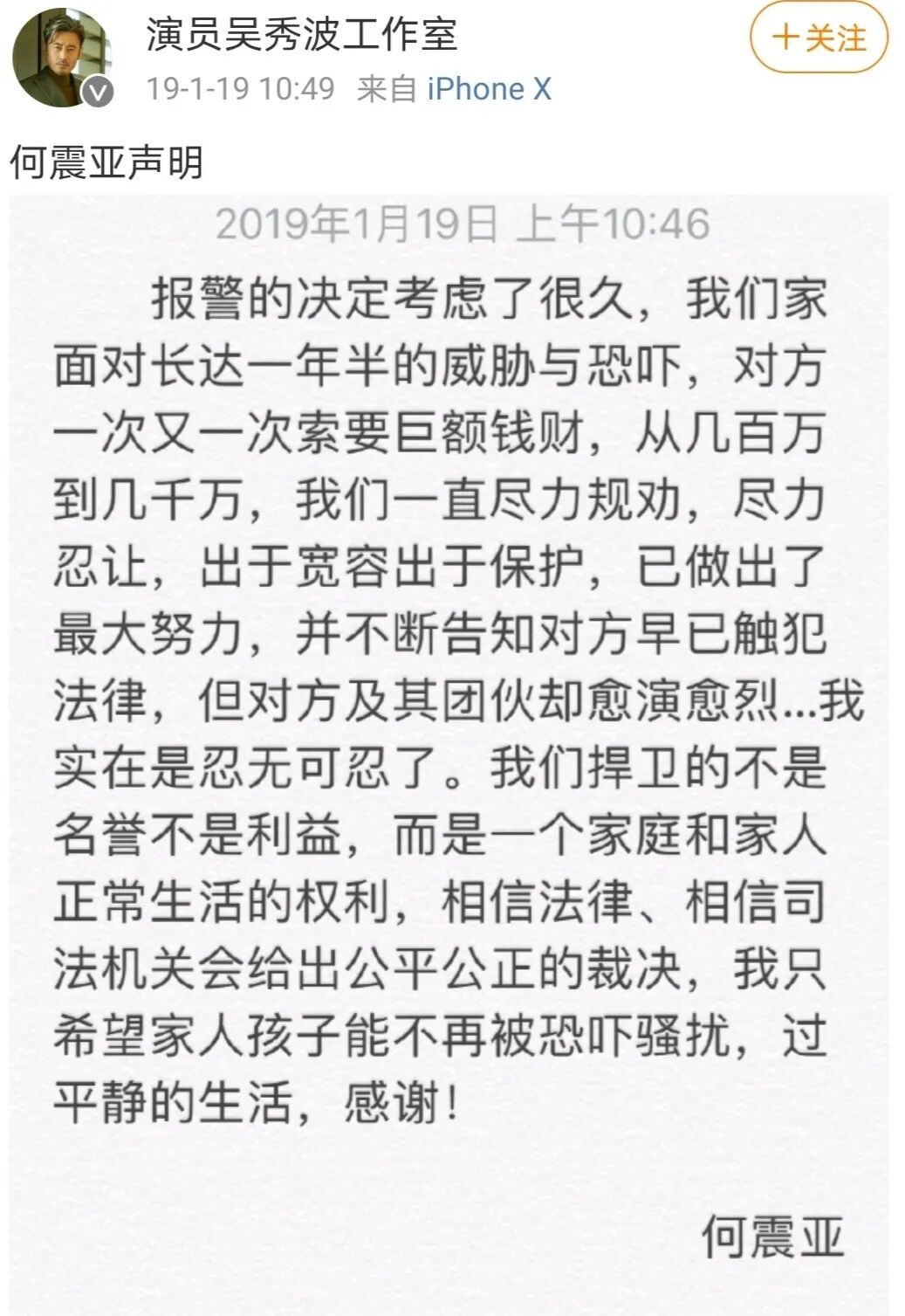 直到吴秀波和原配通过他的工作室发表声明,大伙才知道: