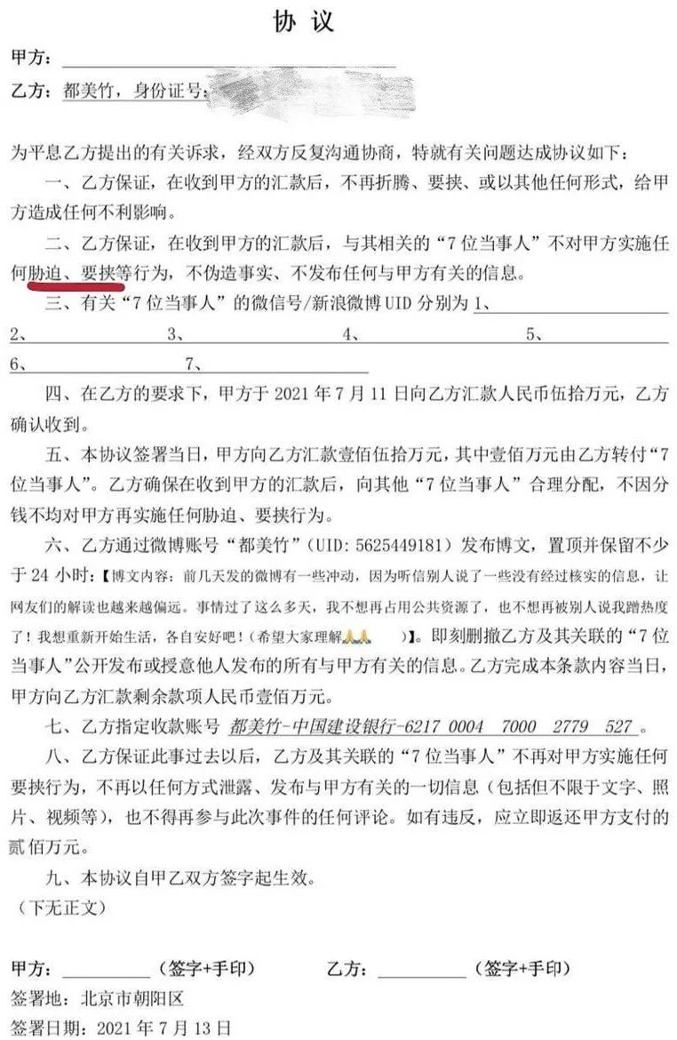 却在协议里暗戳戳地加了“胁迫”、“要挟”等字样。