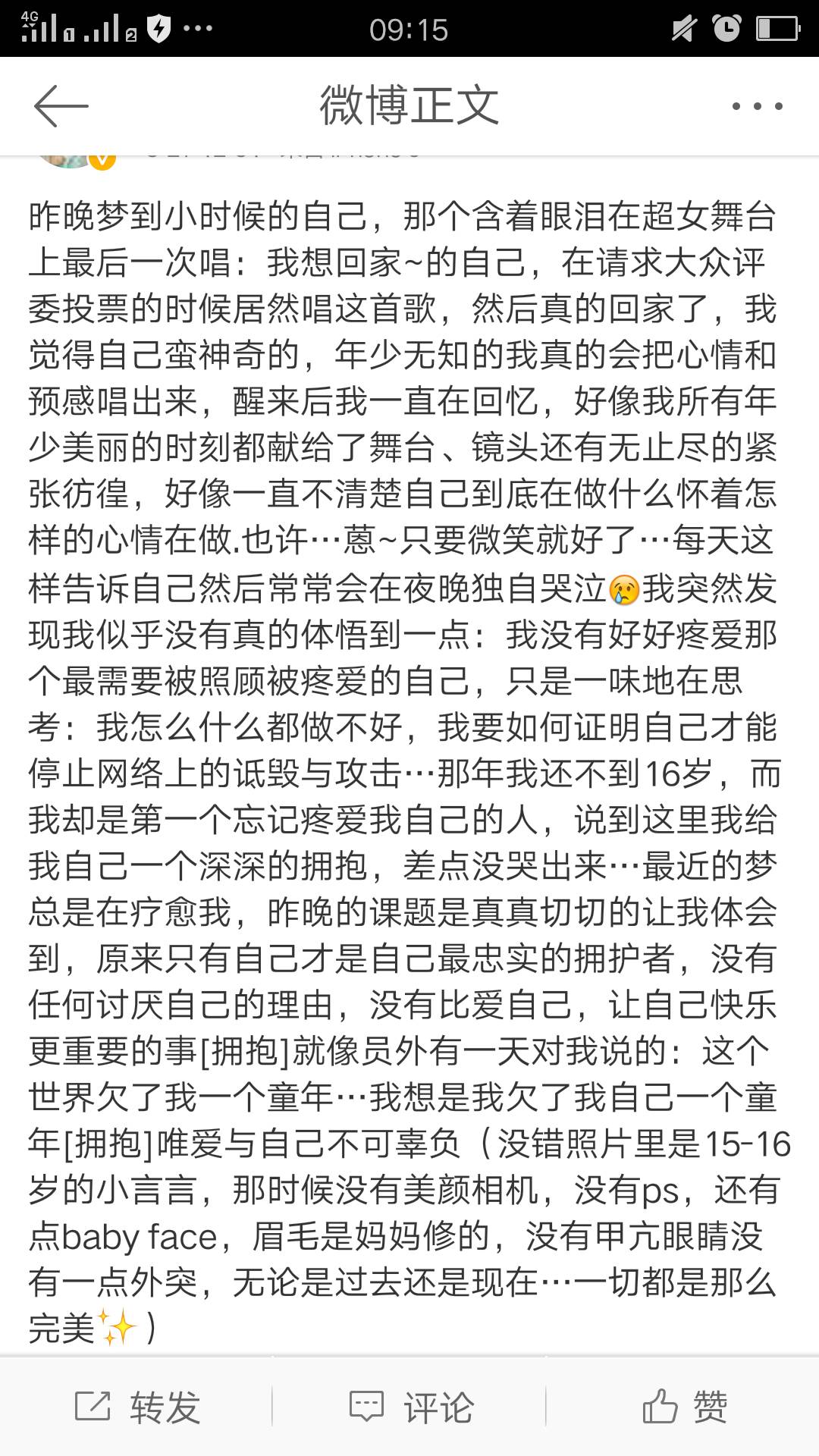 原来这些年的渐渐淡出,是因为身体不适,陆陆续续的在养病。面部的变化尤其是眼睛,也是因为病情所致。这对一个花季的女孩来说是怎样一个打击。而你翻阅她的微博,她却很少提起这段经历。她的微博就像一片净土,有的只是淡然的快乐。就像一个小太阳,在鼓励自己的同时,也宽慰了粉丝与亲朋。