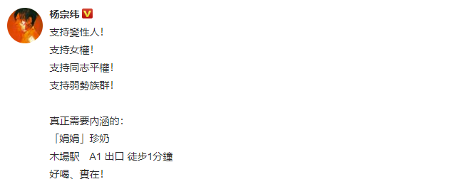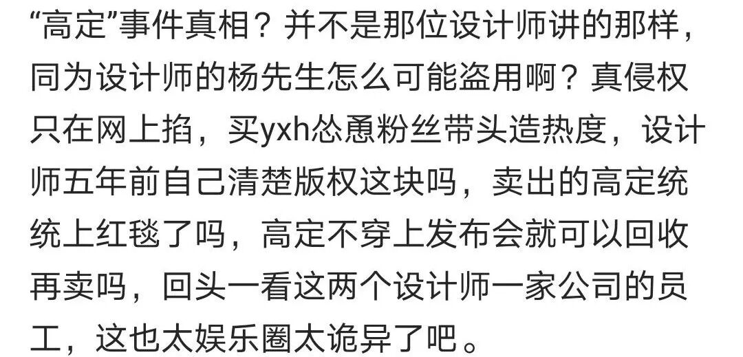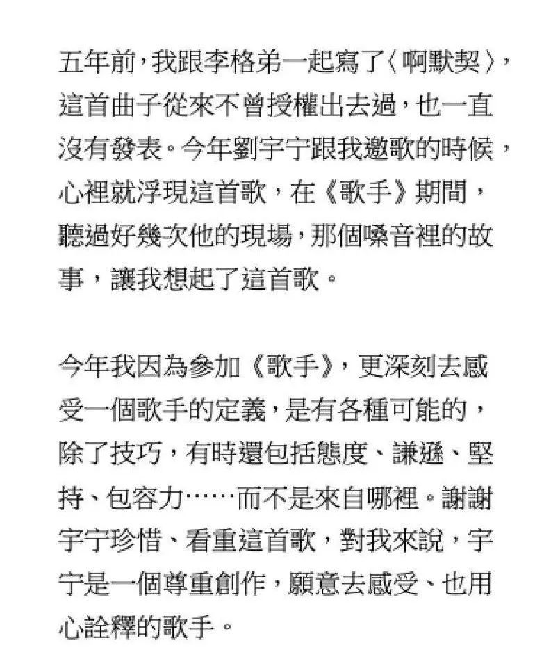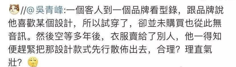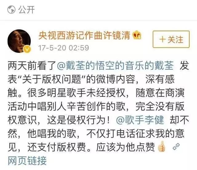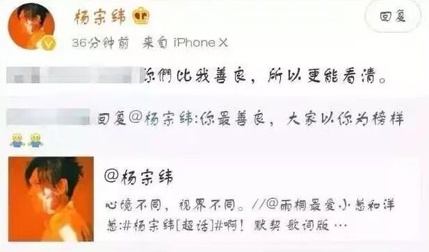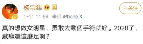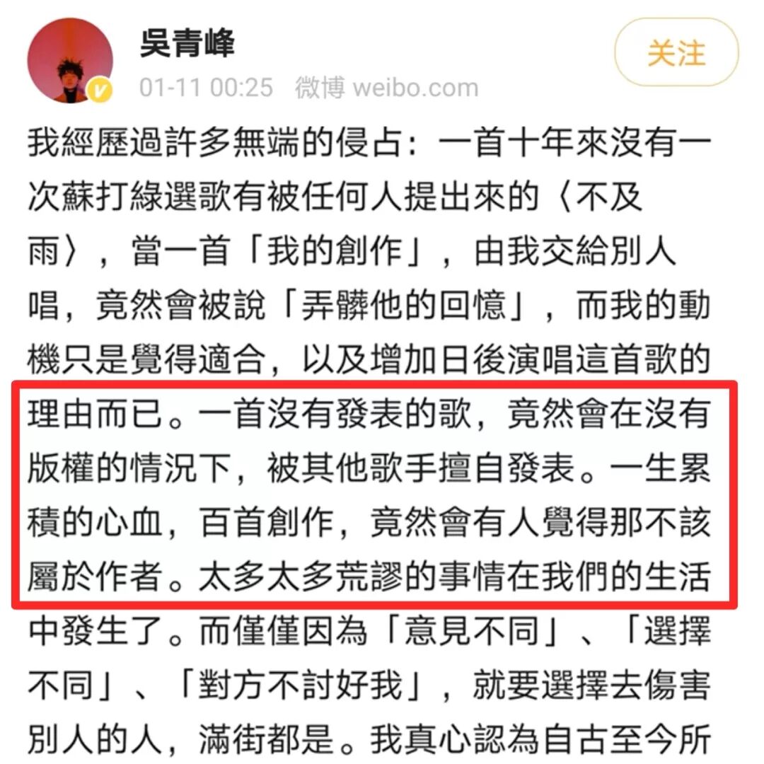 林俊杰一掷千金,吴青峰被嘲“变性”:唱歌的人疯了,还是写歌的人疯了? GirlDaily 港台男星 2020-01-17 21:30:36 1550 创作不易,用心坚持,欢迎请BaGua喝几杯爱心咖啡!打赏并支持本文 打赏并删除本文 2020年的娱乐圈也没让人失望。 前有私生饭脱粉爆本命恋情,后有爱豆“一站到底”式恋爱结婚生娃,简直是步步惊心,根本不容粉丝力挽狂澜。 相比之下,有件小事格外不起眼,却引起了Gigi注意:杨宗纬发文秒删。 提起过去对杨宗纬的印象,最深刻的要追溯到《洋葱》。而最近一次,则是演唱电视主题曲《凉凉》。 而这一次,凉了很久的他忽然下场撕X。 什么水平?看图—— 虽然杨宗纬发出后秒删,但架不住网友的手速,言论一出迅速截图扩散。 瓜到手了,吃瓜群众却开始糊涂了: 女明星,动手术,戏瘾。 短短两句话,三个关键词。火药味虽浓,却指代不明,遮一半藏一半。 这是在骂谁?又为什么骂? 别急,Gigi这就来给大家捋一捋—— 要说清这件事情,就不得不提另外两个人: 青峰,以及摩登兄弟的刘宇宁。 去年11月25日零点,刘宇宁在微博发布新歌《啊默契》,并在正文里感谢了作词人吴青峰和李格弟老师。五个小时后,歌手杨宗纬默默转发了一条粉丝微博。 原博内容,是一首由杨宗纬本人演唱的歌曲试听版。而这首歌不是别的,正是刘宇宁才发布的新歌,《啊默契》。一位才刚刚把自己的新歌趁热发布,另一位就立即放出了自己的版本。 同一天、同个平台的隔空对垒——这是什么乐坛“轮流发歌”的新招数? 再看杨宗纬的配文,“心境不同,视界不同”。仿佛也暗含深意,话里话外,还暗搓搓地diss了刘宇宁一把。 听众们都被搞糊涂了:这歌,到底给了谁来唱? 没让大家等太久。第二天,该歌曲的版权所有人,吴青峰,就站出来说话了。 此前,这首歌从未授权或者发表过。刘宇宁邀歌,于是就把《啊默契》的授权给了他。感谢合作,刘宇宁是一个尊重创作的歌手。 不愧是能说会道的青峰,通篇下来,一字未提无关人士,却句句打中七寸。 ——杨宗纬私自发布音源。——杨宗纬从未拿到过歌曲授权。——杨宗纬盗取同行心血,损害多方利益,还理直气壮。 诸位看客眼观鼻鼻观心,谁对谁错一目了然。有错在先,还要发微博内涵。杨宗纬,有事吗?杨宗纬内涵微博等吴青峰正面硬刚的声明一出,本就不占理的杨宗纬这下更是偃旗息鼓,一声不吭,直接尴尬退场。 本来,事情到这也就结束了。 但今年的1月11日,青峰在微博发了一篇长文。 洋洋洒洒近1500个字,写尽歌手出道以来,15年来的心酸与不易。 而其中提到的指摘和不公平的待遇,却被“有心人”悉数放大: 一首没有发表的歌,竟然会在没有版权的情况下,被其他歌手擅自发表。 一生累积的心血,百首创作,竟然会有人觉得那不该属于作者。 就在同一天,那位“其他歌手”杨宗纬又没忍住,自己下场出来认领了。 方式呢,则是开麦嘲讽,也就是文章开头的那一幕: “真的想做女明星,勇敢去动个手术就好。 2020了,戏瘾还这么足啊?” Gigi不禁感叹,都2020年了,憨批还是一样多。 且不说杨宗纬本就有错在先,这次还上赶着认领回怼,已经让人低看一眼; 这番阴阳怪气的回应,更是充满了对青峰本人,对女明星、甚至对跨性别者的十足偏见。 等到网友们涌去评论区痛批,杨宗纬又潇洒删除原博,转而发布一则新内容: 2020第一份烂公关,就这样火热出炉。 一个歌手,戏居然比演员还多,也不知道杨宗纬有没有考虑过转行。 都说“恶徼以为知者,恶不孙以为勇者”。杨宗纬以小聪明行径侵权,又将傲慢充当孤勇,攻击、丑化他人名誉。 他有没有输掉才华不敢说,品格这一栏,先给低分。 这几番恶意,无怪被网友冠以小偷之名,甚至给他专门建了词条:#乐坛小偷杨宗纬#、#杨宗纬违法偷歌第一人#。 不过,光有这些,还远远不够。 别急,Gigi说的“不够”,并不是指对杨宗纬的批评,不够力度。 更重要的是,撇去这起事件中的多余操作,回归最本质、最核心的问题。 ——作品侵权。 杨宗纬擅自发布《啊默契》试唱版本,并没有经过歌曲著作人青峰许可,已经构成了侵权行为。 而青峰之前在评论所述,非常形象地用类比diss过这一做法: 一个客人去逛品牌,看到自己喜欢的设计,反复试穿却并未购买; 品牌方空等多年后,选择把衣服卖给别人; 客人却因为之前目睹过实物,直接对外发布了设计款式。 什么意思? ——吃不起,就毁掉。杨宗纬的态度是,“我唱不了,那唱的人也别想好过”。 这是明晃晃的无理、无德、无赖行径,可他全然不怕事大,越闹越荒唐。 也有粉丝发文为杨宗纬开脱,说他其实同为“设计师”,同样拥有歌曲的制作版权; 网友认情,也认理,因此并未一边倒地抗拒,而是都在等一个直接的证据。 但,没有。杨宗纬一方,迟迟给不出一份证明材料,表明其同为创作人。 所以这一闹,摆明了是不怕真相被捅。 不但赚足了热度、流量,而且除了众人对其道德上的攻讦之外;他不会受到任何实际上的惩罚。 甚至这整个事件,除了在热搜榜上昙花一现之外,也并没能真正脱离小圈子。 “关起门来打狗”,痛快是痛快了,可是然后呢? 阻止不了下一个“杨宗纬”出现。 如果不是杨宗纬此番发言过于“石破天惊”,如果不是因为他撞上的是天不怕地不怕的“怼人小王子”青峰; 那么这起侵权事件,大概也会如过去的数桩数件一般,成为纠缠不清、雾里看花的烂账。 所以比起痛批杨宗纬的语言