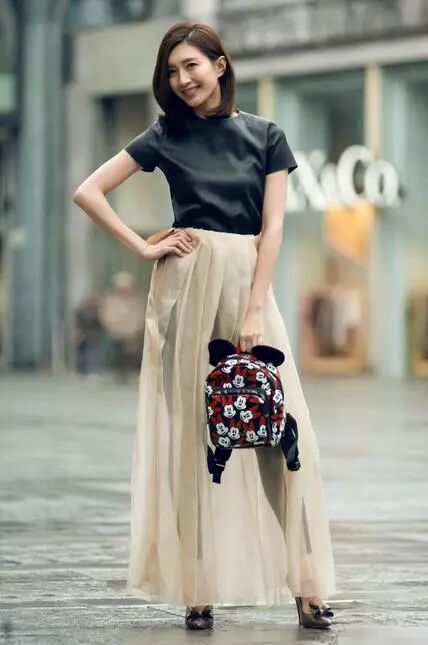 黑色T恤搭配裸色的薄纱长裙,内搭一件黑色打底,脚踩可爱的蝴蝶结高跟鞋,手拿米奇双肩包,兼具少女的俏皮和小女人性感的一身穿搭!