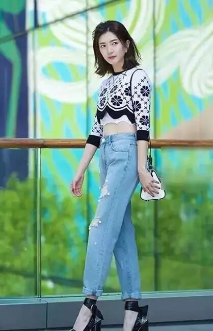 白底黑色印花超短上衣搭配宽松的牛仔裤,性感小蛮腰尤为抢镜!脚踩个性十足黑色高跟凉鞋,凌乱美的齐肩发,如此时髦有活力的小姐姐江疏影你喜欢吗?