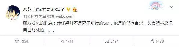 对于某些传闻,知名博主“八卦_我实在是太CJ”再爆料称,乔任梁并不是死于所传的SM,而是抑郁症自杀,并且是头套着塑料袋把自己闷死的。