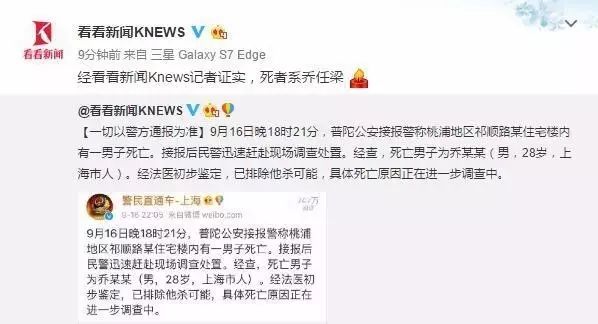 上海警方发出了这样一条微博,上海某住宅楼内,28岁的乔某某死亡~,排除他杀……