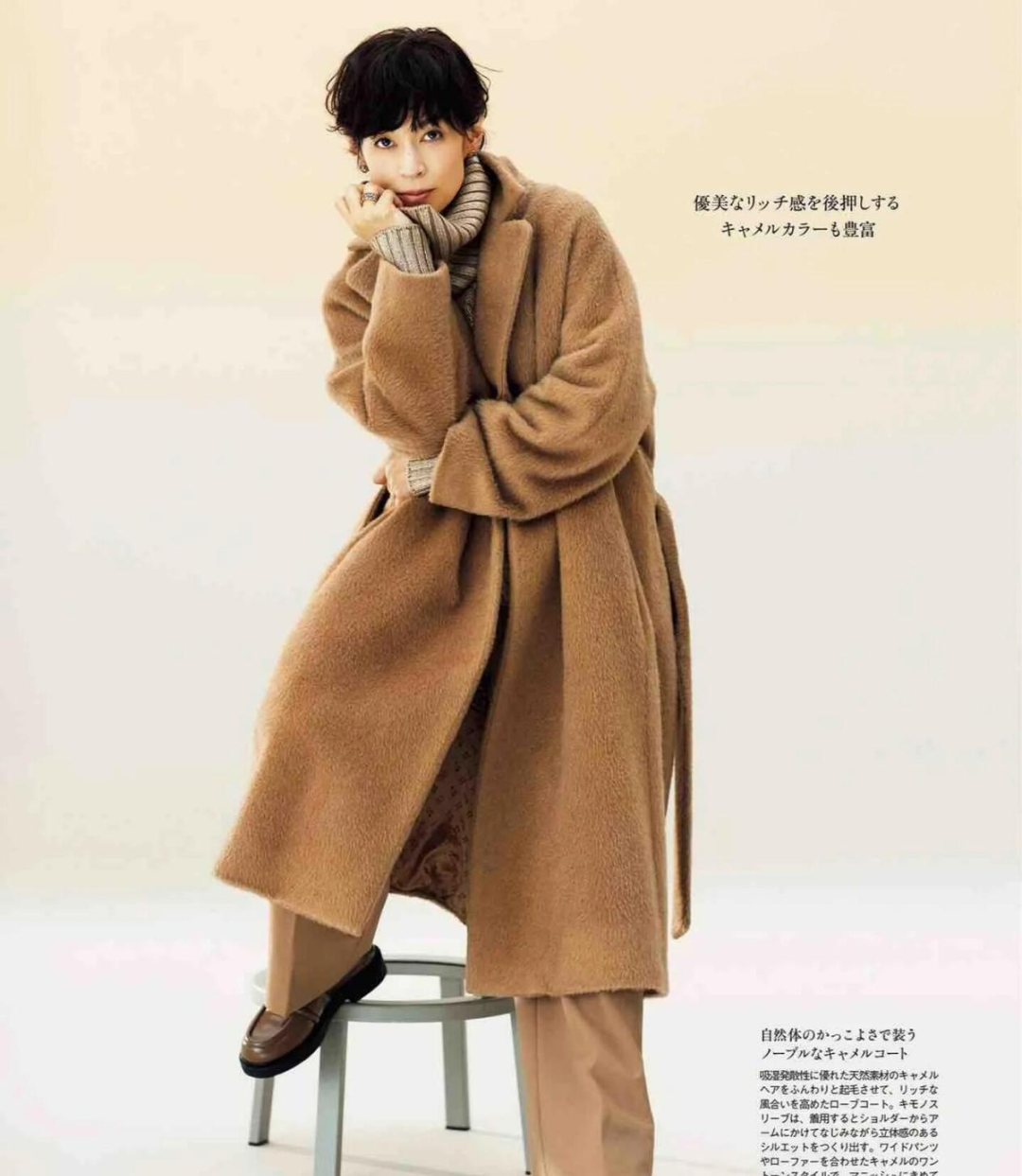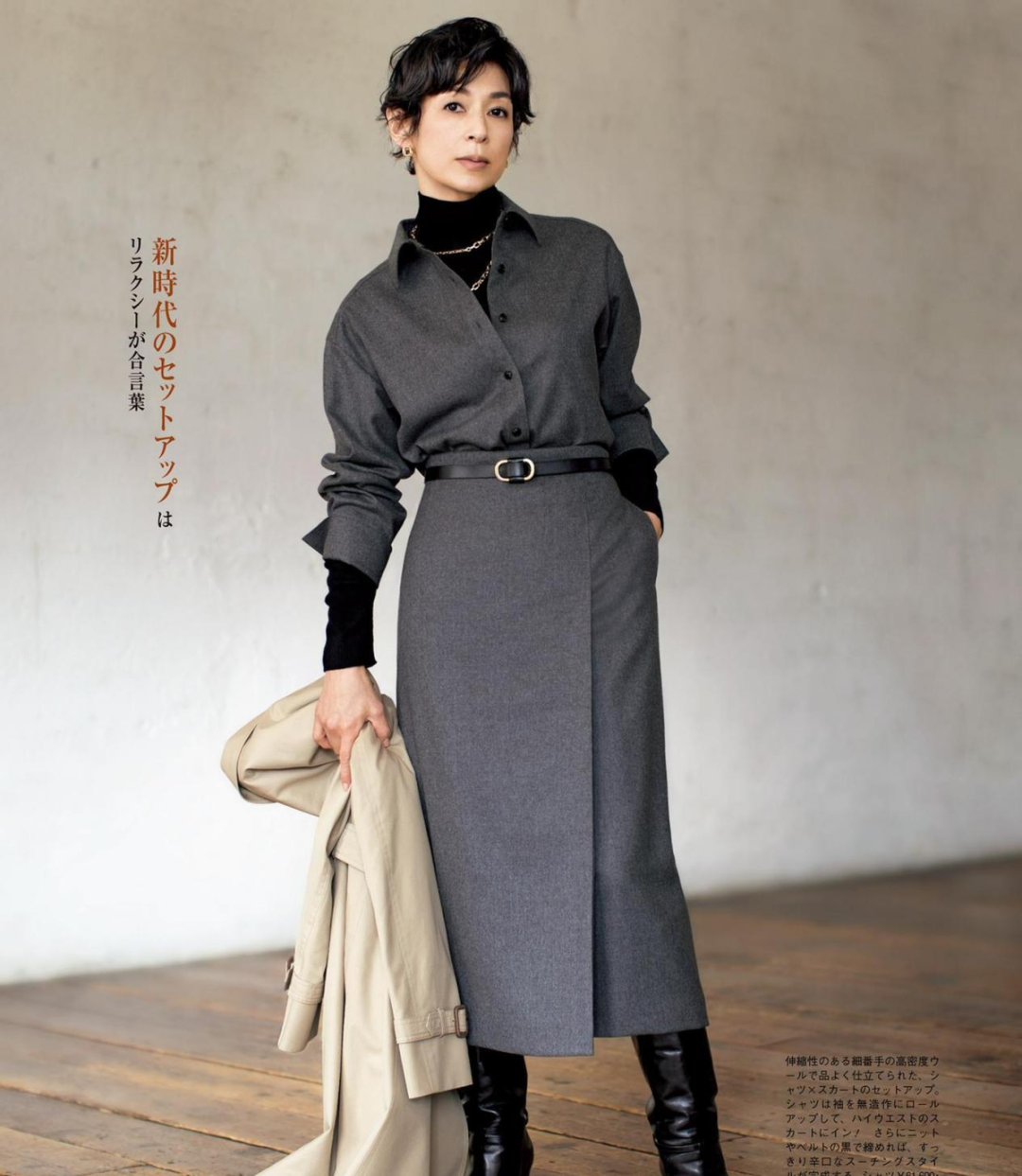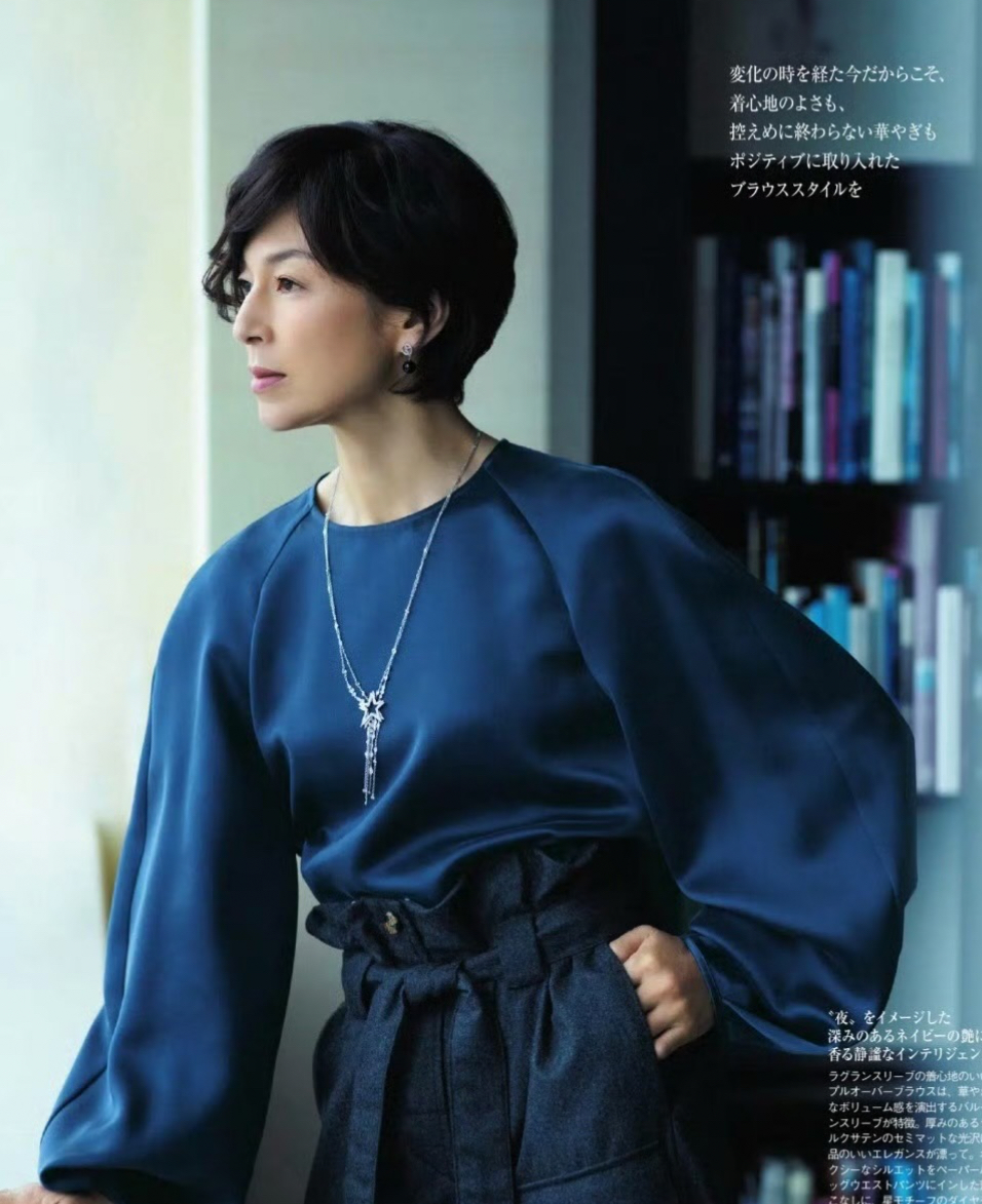 很多时候一条裤子就能拉开气场的差距。铃木保奈美常穿的裤型,宽是宽,裤长却刚好落在鞋面上方1-2厘米,正好不堆积。比起那种拖拉的裤脚,这种刚刚好的长度,视觉上很容易让整个人显高不显胖。而且宽阔但薄挺的西裤,坐一上午也不容易起褶,久坐8小时下来还能保持干净。