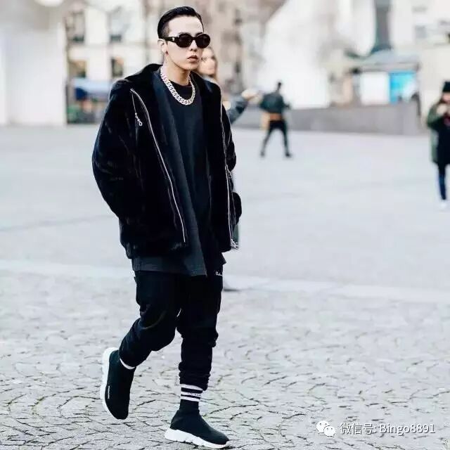 先是我们身为亚洲潮流 ICON 的 G-dragon,虽然很多人觉得我们的GD爱乱搭衣服,但他也还是有着穿什么火什么的能力,去看Vetements的大秀时,选择了用Vetements的袜子叠穿上这款Balenciaga的袜靴,这一身搭配还是很赞的!
