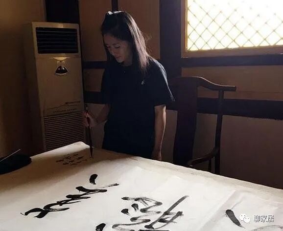 很难想象在我们印象中,舞台上总是那么活泼好动的谢娜也有着这么安静的一面,窗外的光线正好照在桌子上的宣纸上,谢娜正在用心写字。