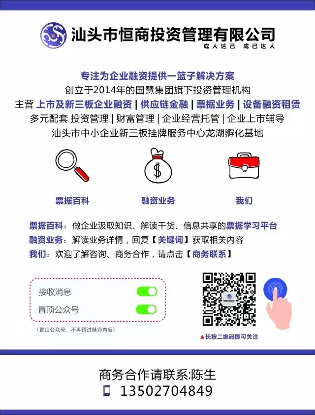 汕头市中小企业新三板挂牌服务中心·龙湖孵化基地——汕头市恒商投资管理有限公司,专注为新三板企业提供市值管理咨询、企业信用贷款、股东信用贷款、股权质押贷款、设备融资租赁等;为中小企业提供应收账款保理、设备融资租赁、供应链金融等多项细分业务,深耕潮汕市场多年,是您身边值得信赖的市值管理专家!
