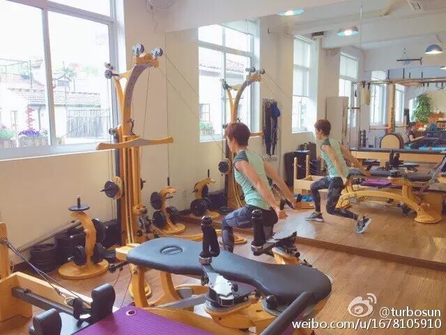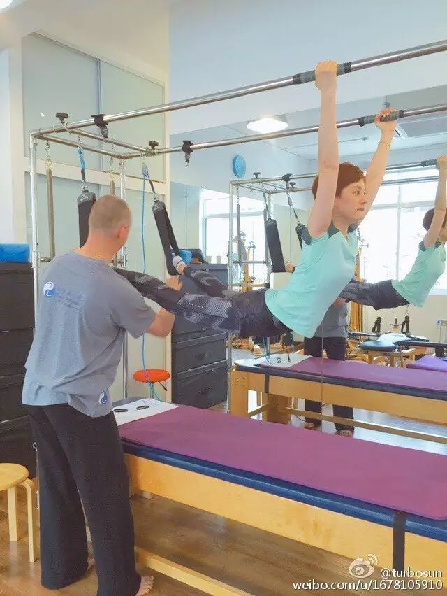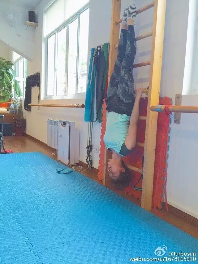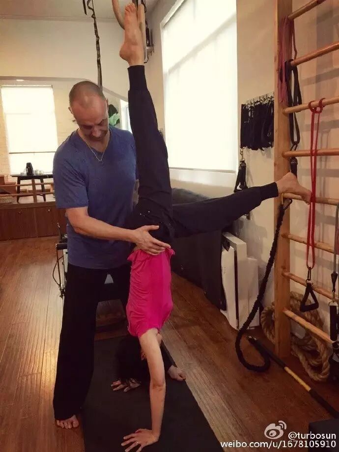 不信你看,2015年的她就开始跟着普拉提教练练习倒立了: