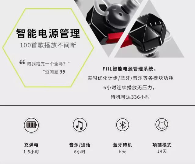 FIIL Carat还拥有本地存储功能;在续航方面,FIIL的智能电源管理系统,可以实现6小时连续播放,待机最长可达336小时。