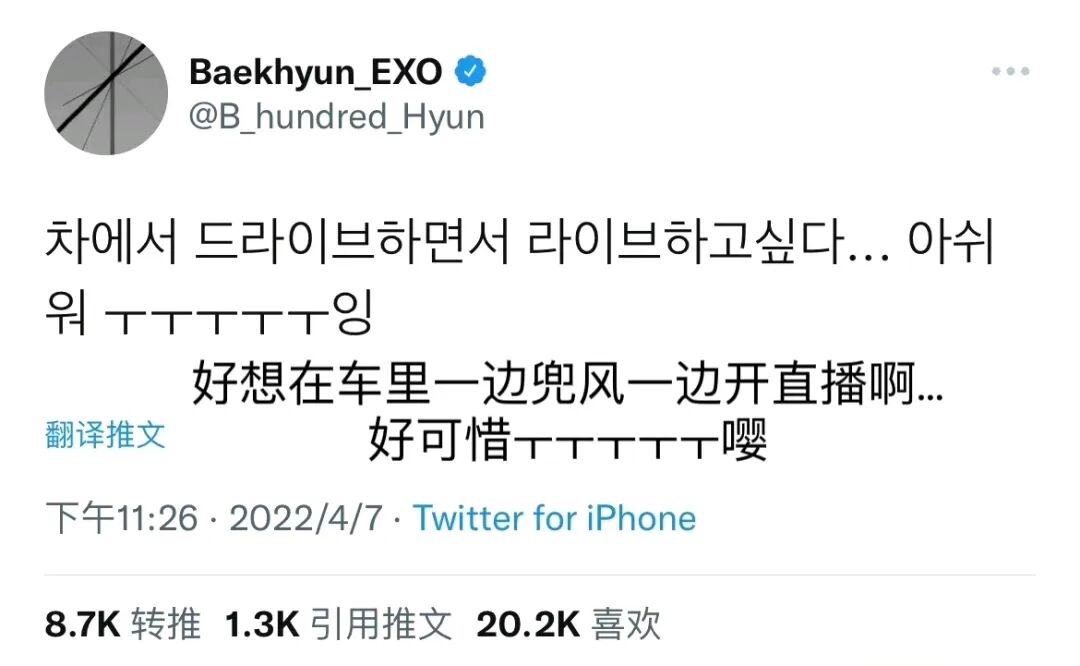 边伯贤还发文表示可惜,不能一边开车兜风一边给粉丝们做直播