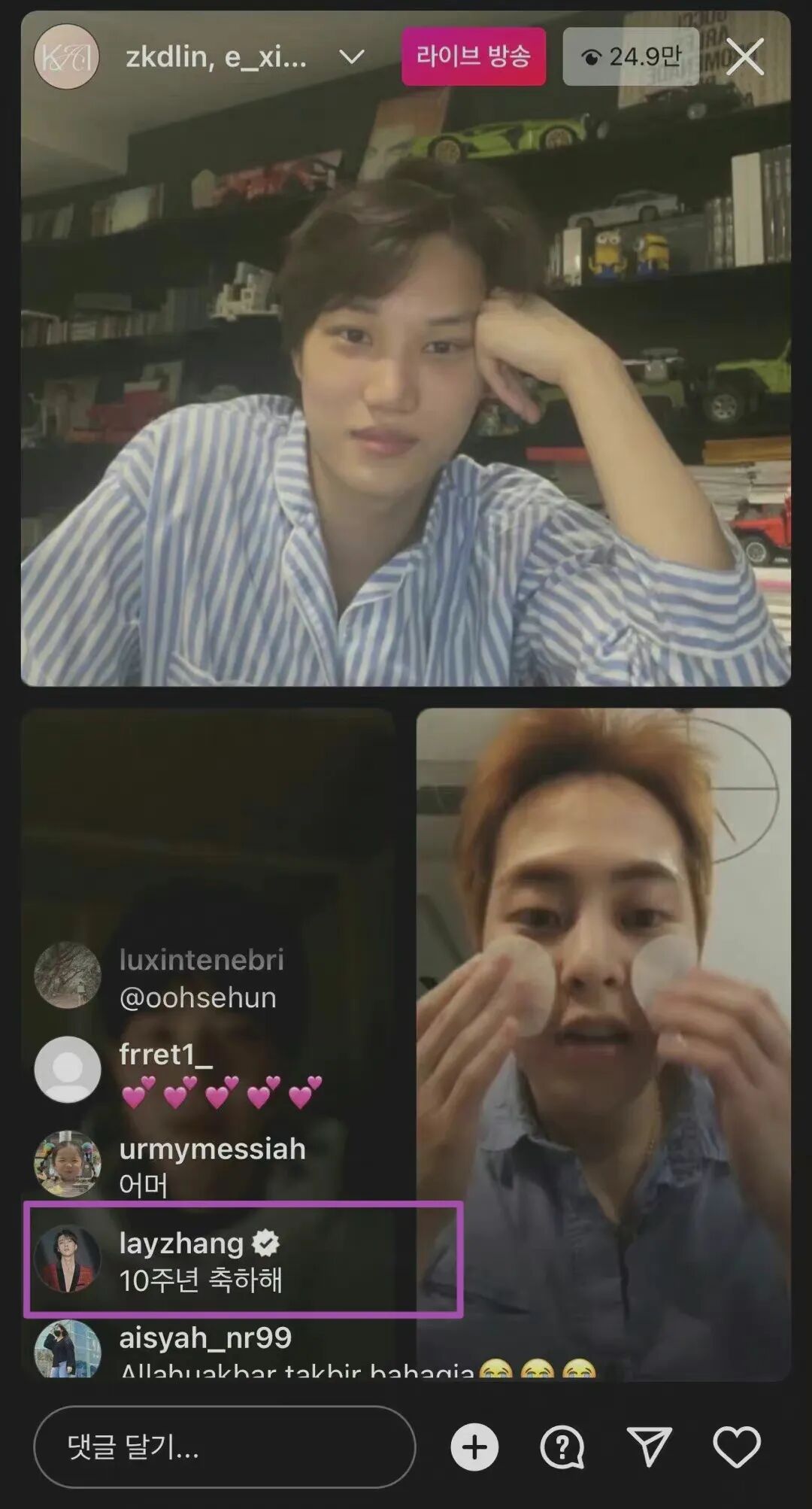 凌晨,几位exo韩国成员:金钟仁(KAI)、金珉锡(XIUMIN)、金俊勉(SUHO)一起直播庆祝十周年!